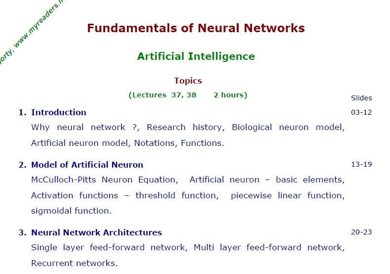شبكه عصبی، موضوعات: مقدمه؛ مدل نورون زیستی، مدل نورون مصنوعی، تذكرات، توابع، مدل نورون مصنوعی، معادله McCulloch- Pitts؛ عناصر اصلی- نورون مصنوعی، توابع فعال سازی، تابع آستانه، تابع خطی تكه ای، تابع حلقوی؛ معماری های شبكه عصبی- شبكه فوروارد- تغذیه تك لایه؛ شبكه فوروارد- تغذیه چند لایه، شبكه های بازگشت كننده؛ روش های یادگیری در شبكه های عصبی- یادگیری نظارت نشده، یادگیری تقویت شده، یادگیری Hebbian، یادگیری نزول گرادیان، یادگیری رقابتی، یادگیری تصادفی. سیستم NN تك لایه- دریافت تك لایه، الگوریتم یادگیری برای آموزش، وظیفه جدا شدنی خطی، مسئله XOR، الگوریتم یادگیری. مكانیسم آموزش و معماری عنصر خطی انطباقی (ADALINE)؛ كاربردهای دسته بندی- شبكه های عصبی؛ طبقه بندی، تشخیص الگو؛ تخمین تابع؛ سیستم های پیش بینی.
