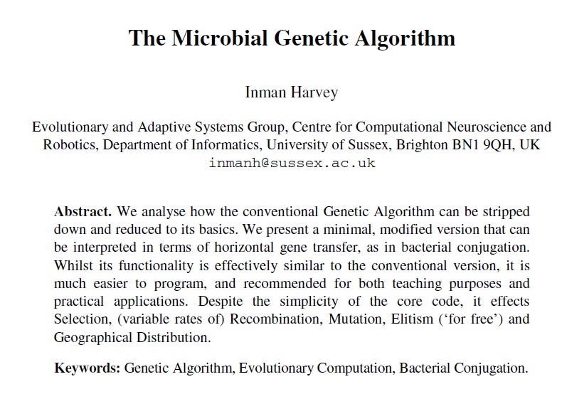 ما آنالیز می کنیم که چگونه الگوریتم ژنتیکی معمولی را ساده نمود و آن را به اصول اولیه آن کاهش داد. ما یک نسخه ی اصلاح شده ی حداقلی را نمایش می دهیم (ارائه می کنیم) که می تواند در شرایط انتقال ژنی افقی، همانگونه در آمیزش (ترکیب) باکتریایی می باشد، تفسیر شده باشد. در حالیکه قابلیت های آن به طور مؤثری شبیه به نسخه ی معمولی است، برنامه ریزی آن بسیار آسان تر است و برای هر دو هدف آموزشی و کاربردهای عملی، توصیه شده است. با وجود سادگی کد هسته، آن روی انتخاب، (نرخ های مختلفی از) ترکیب مجدد، جهش، نخبه گرایی (به صورت رایگان) و توزیع جغرافیایی تأثیر می گذارد.