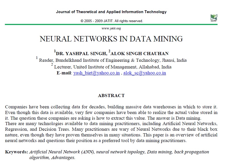تکنولوژی های زیادی در دسترس کارورزان استخراج داده ها می باشد، از جمله: شبکه های عصبی مصنوعی رگرسیون و درخت های تصمیم گیری بسیاری از کارورزان نسبت به شبکه های عصبی محتاط می باشند و دلیل این امر هم این مقاله یک بررسی اجمالی از شبکه های عصبی می باشد و موقعیت آن ها را به عنوان ابزار مورد نظر کارمندان به جمالش می کشاند.