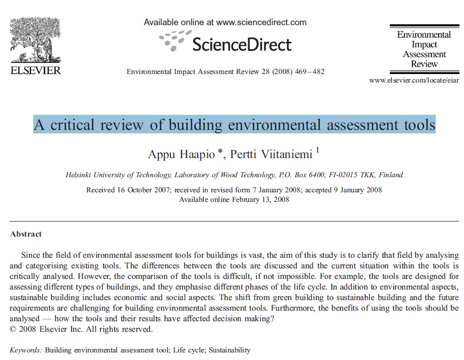از آنجائیکه زمینه ی ابزارهای ارزیابی محیطی برای ساختمان ها گسترده است ، هدف این مطالعه روشن ساختن یک زمینه با تحلیل و طبقه بندی ابزارهای موجود است. تفاوت های بین ابزارها مورد بحث قرار دارند و موقعیت فعلی درون ابزارها به صورت انتقادی تحلیل شده است. اگرچه ، مقایسه ی ابزارها امری مشکل است اما غیر ممکن نمی باشد. برای نمونه ، ابزارها برای ارزیابی انواع مختلفی از ساختمان ها طراحی شده اند و آنها بر مراحل مختلف چرخه ی زندگی تاکید می کنند. علاوه بر مشخصه های محیطی ، ساختمان های پایدار شامل مشخصه های اقتصادی و اجتماعی هستند. انتقال و تغییر از ساختمان سبز به ساختمان پایدار و الزامات و شرایط آینده ی ابزارهای ارزیابی ساختمان محیطی امری چالش برانگیز هستند. علاوه براین ، مزایای استفاده از این ابزارها باید تحلیل گردند – چگونه ابزارها و نتایج آنها بر تصمیم گیری تاثیر گذار هستند.