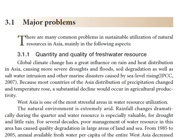 Global climate change has a great influence on rain and heat distribution in Asia, causing more severe droughts and floods, soil degradation as well as salt water intrusion and other marine disasters caused by sea-level rising(IPCC, 2007). Because most countries of the Asia distribution of precipitation changed and temperature rose, a substantial decline would occur in agricultural productivity. West Asia is one of the most stressful areas in water resource utilization. The natural environment is extremely arid. Rainfall changes dramatically during the quarter and water resource is especially valuable, for drought and little rain. For several decades, poor management of water resource in this area has caused quality degradation in large areas of land and sea. From 1985 to 2005, annual available fresh water per capita of the entire West Asia decreasedfrom 1700 m3 to 907 m3, due to population growth in future, which is expected to decrease to 420 m3 by the year 2050(UNESCWA, 2003).