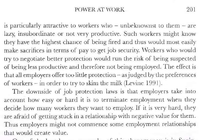 is particularly attractive to workers who - unbeknownst to them - are lazy, insubordinate or not very productive. Such workers might know they have the highest chance of being fired and thus would most easily make sacrifices in terms of pay to get job security. Workers who would try to negotiate better protection would run the risk of being suspected of being less productive and therefore not being employed. The effect is that all employers offer too little protection - as judged by the preferences of workers - in order to try to skim the milk (Levine 1991)..
