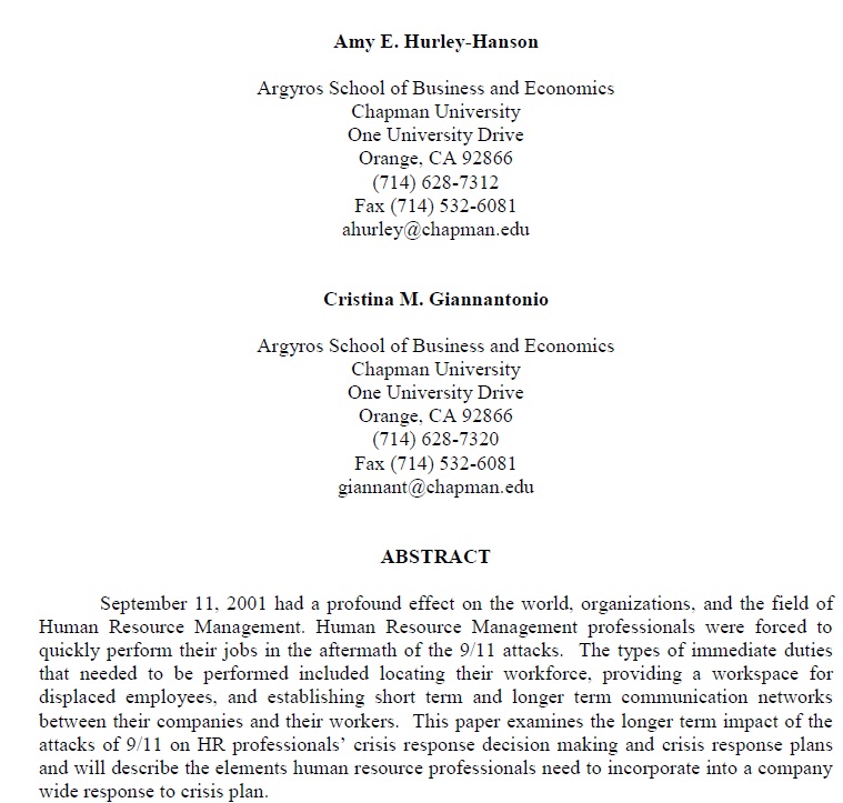 یازدهم سپتامبر سال 2001 تاثیر عمیقی بر جهان، سازمان ها و رشته مدیریت منابع انسانی گذاشت . صاحب نظران مدیریت منابع انسانی مجبورشدند به سرعت وظایف خود را در پسایند حملات نهم و یازدهم به انجام برسانند. انواع وظایف ضروری که نیاز به انجام بود شامل : مستقر ساختن نیروی کار خود ، فراهم ساختن فضای کار برای کارمندان جایگزین شده، برقرار ساختن شبکه های ارتباطی کوتاه مدت و بلند مدت بین شرکت ها و کارگران خود می شد. این مقاله اثر شدید بلندمدت تر حملات نهم و یازدهم بر تصمیم گیری صاحب نظران منابع انسانی جهت واکنش به بحران و طرح های واکنش به بحران را موردبررسی قرار داده و عناصری که صاحب نظران منابع انسانی به منظور تلفیق واکنش سریع یک شرکت با طرح بحران نیاز دارند را شرح خواهد داد.