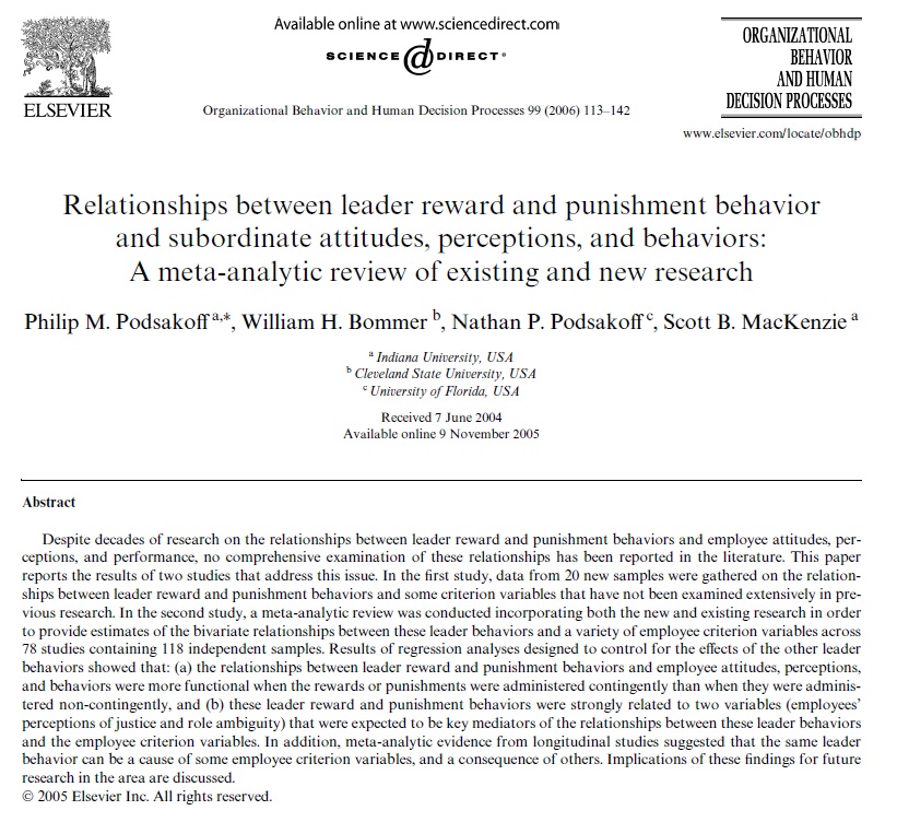 Despite decades of research on the relationships between leader reward and punishment behaviors and employee attitudes, perceptions, and performance, no comprehensive examination of these relationships has been reported in the literature. This paper reports the results of two studies that address this issue. In the first study, data from 20 new samples were gathered on the relationships between leader reward and punishment behaviors and some criterion variables that have not been examined extensively in previous research. In the second study, a meta-analytic review was conducted incorporating both the new and existing research in order to provide estimates of the bivariate relationships between these leader behaviors and a variety of employee criterion variables across 78 studies containing 118 independent samples. Results of regression analyses designed to control for the effects of the other leader behaviors showed that: (a) the relationships between leader reward and punishment behaviors and employee attitudes, perceptions, and behaviors were more functional when the rewards or punishments were administered contingently than when they were administered non-contingently, and (b) these leader reward and punishment behaviors were strongly related to two variables (employees’ perceptions of justice and role ambiguity) that were expected to be key mediators of the relationships between these leader behaviors and the employee criterion variables. In addition, meta-analytic evidence from longitudinal studies suggested that the same leader behavior can be a cause of some employee criterion variables, and a consequence of others. Implications of these findings for future research in the area are discussed.