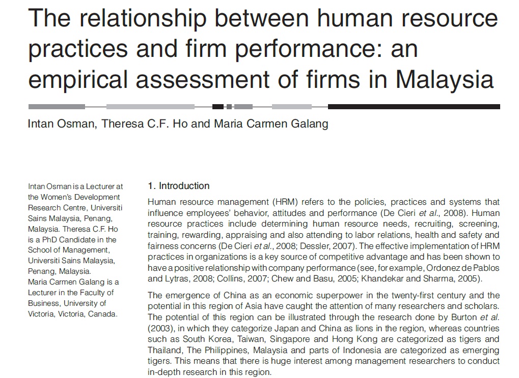 Human resource management (HRM) refers to the policies, practices and systems that influence employees’ behavior, attitudes and performance (De Cieri et al., 2008). Human resource practices include determining human resource needs, recruiting, screening, training, rewarding, appraising and also attending to labor relations, health and safety and fairness concerns (De Cieri et al., 2008; Dessler, 2007). The effective implementation of HRM practices in organizations is a key source of competitive advantage and has been shown to have a positive relationship with company performance(see, for example, Ordonez de Pablos and Lytras, 2008; Collins, 2007; Chew and Basu, 2005; Khandekar and Sharma, 2005). The emergence of China as an economic superpower in the twenty-first century and the potential in this region of Asia have caught the attention of many researchers and scholars. The potential of this region can be illustrated through the research done by Burton et al.(2003), in which they categorize Japan and China as lions in the region, whereas countries such as South Korea, Taiwan, Singapore and Hong Kong are categorized as tigers and Thailand, The Philippines, Malaysia and parts of Indonesia are categorized as emerging tigers. This means that there is huge interest among management researchers to conduct in-depth research in this region.