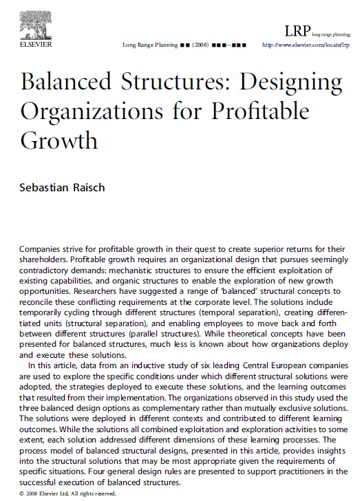 سباستین رایش: تلاش شرکت ها برای رشد مناسب در جهت پاسخگویی به درخواست سهام داران برای افزایش سود بیشتر است. رشد مناسب سازمانها نیازمند طراحی سازمان به گونه ای است که بتواند پاسخگوی تقاضاهای متناقض باشد مانند اینکه یک سازمان نیاز دارد که هم ساختار مکانیک داشته باشد تا بتواند اطمنیان حاصل کند از دستاوردهای فعلی اش محافظت می شود و همچنین نیازمند ساختار ارگانیک است تا سازمان را برای یافتن فرصت هایی در جهت رشد در زمینه های جدید یاری کند. این مقاله "سطحی از تعادل" را در ساختار شرکت ها پیشنها د می کند که نیاز شرکت ها را در سطح گروهی برطرف می کند. برای رسیدن به این سطح تعادل راه حل پیشنهادی شامل تغییر پی در پی در بین ساختار متفاوت (تفکیک موقت) ، و یا به وجود آوردن واحدهای متمایز (تفکیک ساختاری) و اجازه به کارکنان درجهت به حرکت به سمت عقب و جلو در ساختار مختلف (ساختار موازی). هنگامی که مفاهیم تئوری در ساختار متعادل ارائه شد اطلاعات کمی در مورد نحوه استقرار آن و چگونگی اجرای آن موجود بود. در این مقاله، داده ها از طریق مطالعه استقرایی در شش شرکت که مرکز آن ها در اروپا بود جمع آوری شد و در آن پاسخ سازمانها به ساختارهای مختلف مورد بررسی قرار گرفت.