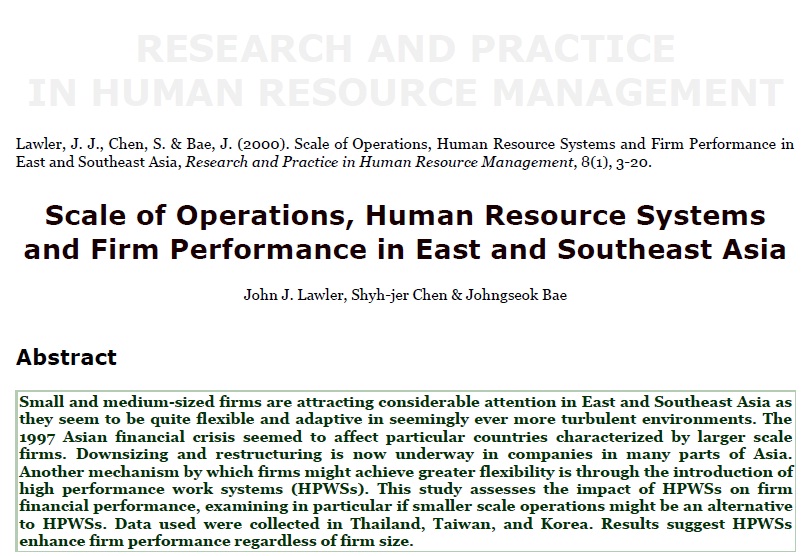 سازمانهای کوچک و متوسط در آسیای شرقی و جنوب شرقی بصورت قابل ملاحظه ای جلب توجه می نمایند و آنها در محیطهای متلاطم و آشفته کاملاٌ انعطاف پذیر بوده و قابل تطبیق میباشند.در سال1997بحران ما لی آسیابرروی کشورهایی اثر گذاشت که از مشخصه های آنها داشتن شرکتهای بزرگ است.بحث کوچک سازی و ساختاردهی مجدد دربسیاری شرکتهای آسیایی در جریان است.مکانیزم دیگری که بوسیله موسسات ممکن است انعطاف پذیری زیادی به آنها بدهد از طریق ابداع HPWSs(سیستمهای کاری عملکرد بالا) میباشد.این مطالعه اثر HPWS رادر عمکلرد مالی آنها ارزیابی میکند،اطلاعات استفاده شده از کشورهای تایلند،تایوان وکره جمع آوری شده است.نتایج پیشنهاد میدهد HPWSعمکلرد شرکتها را صرف نظر از اندازه آنها ارتقاء میدهد.