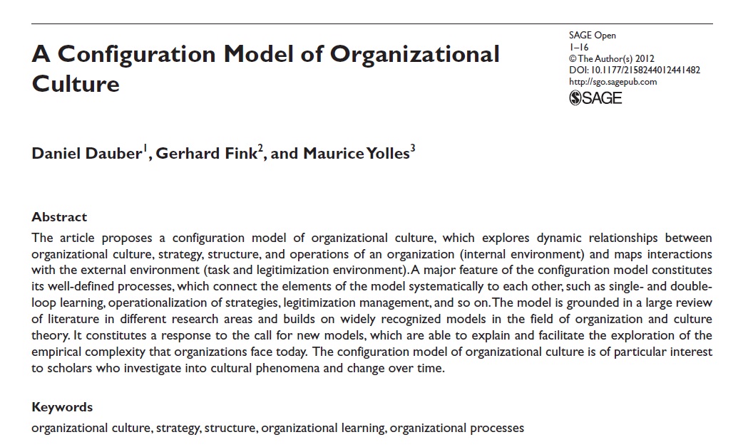 The article proposes a configuration model of organizational culture, which explores dynamic relationships between organizational culture, strategy, structure, and operations of an organization (internal environment) and maps interactions with the external environment (task and legitimization environment). A major feature of the configuration model constitutes its well-defined processes, which connect the elements of the model systematically to each other, such as single- and double-loop learning, operationalization of strategies, legitimization management, and so on. The model is grounded in a large review of literature in different research areas and builds on widely recognized models in the field of organization and culture theory. It constitutes a response to the call for new models, which are able to explain and facilitate the exploration of the empirical complexity that organizations face today. The configuration model of organizational culture is of particular interest to scholars who investigate into cultural phenomena and change over time.