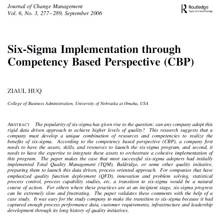 محبوبیت شش سیگما باعث طرح این پرسش شده است که آیا هر شرکتی میتواند از این رویکرد داده محور سفت و سخت به منظور دستیابی به سطوح بالاتری از کیفیت استفاده کند؟ این تحقیق نشان می دهد که یک شرکت باید ترکیب منحصر به فردی از منابع و توانمندیها را برای تحقق بخشیدن به منافع شش سیگما به کار ببرد. بر اساس چشم انداز مبتنی بر توانمندی ها(CBP) یک شرکت در ابتدا نیاز به دارایی، مهارت و منابعی برای راه اندازی برنامه شش سیگما دارد و پس از آن نیازمند نیروی متخصص است تا این دارایی ها را یکپارچه و یکدست کند تا بدینوسیله اجرای منسجم این برنامه را رهبری کند. در این مقاله همچنین اشاره شده است که موفق ترین گیرنده های شش سیگما در ابتدا برنامه ی مدیریت جامع کیفیت (TQM)، یا نرم افزار تدوینی بالدریج، یا دیگر طرح های ابتکاری کیفیت را به اجرا در آورده اند که آنها را برای راه اندازی و اجرای این رویکرد فرایندگرای داده محور آماده می کند. برای شرکت هایی که بر روی توسعه عملکرد کیفیت (QFD)، نوآوری در حل مسائل، کنترل فرآیند آماری، مطالعات با قابلیت پروسه ای و غیره تاکید داشته اند حرکت به سوی شش سیگما امری طبیعی و عادی خواهد بود. برای دیگر شرکت ها که در مراحل اولیه این برنامه ها هستند، پیشرفت شش سیگما ممکن است بسیار کند و خسته کننده باشد. این مقاله با کمک یک مطالعه موردی اعتبار این نظرات را تایید میکند. برای شرکت مورد مطالعه، انتقال به شش سیگما کار آسانی بود زیرا آنها از طریق تاریخچه ی طولانی طرحهای ابتکاری کیفیت به اندازه کافی به جمع آوری و ذخیره ی داده های عملکرد پروسه، نیاز های مشتری، زیرساخت ها و توسعه ی رهبری اقدام کرده بودند.
