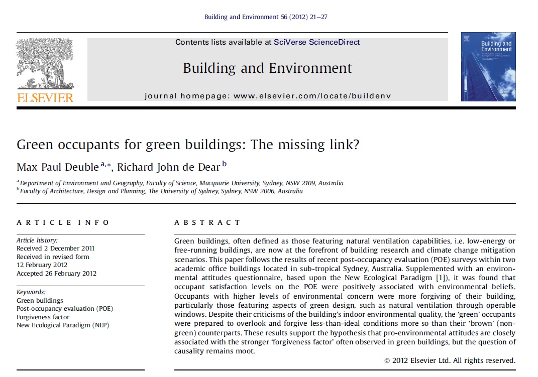 ساختمان سبز که اغلب به عنوان ساختمان های با قابلیت تهویه طبیعی، یعنی ساختمان های با انرژی پایین یا فعال آزاد، تعریف می شوند حالا طلایه دار تحقیق ساختمانی و سناریوهای کاهش تغییر اقلیم هستند. این مقاله نتایج پیمایش های ارزشیابی بعد از سکونت (POE) اخیر در دو ساختمان اداری آکادمیک را دنبال می کند که در منطقه نیمه استوایی سیدنی، استرالیا، واقع شده اند. با توجه به پرسشنامه گرایش های زیست محیطی براساس نمونه اکولوژیکی جدید مشخص شد که سطح رضایت سکنه در POE رابطه مثبتی با باورهای زیست محیطی داشت. سکنه با سطح بالاتر نگرانی زیست محیطی درباره ساختمان های خود بخشنده تر بودند، مخصوصا در رابطه با جنبه های طراحی سبز مثل تهویه طبیعی از طریق پنجره های دایر این حس را داشتند. علیرغم انتقادات کیفیت زیست محیطی داخلی ساختمان، سکنه 'سبز' بیشتر از همتاهای 'قهوه ای' (غیر سبز) خود برای نادیده گرفتن و بخشش شرایط کمتر از ایده آل آمادگی داشتند. این نتایج فرضیه ای که گرایش های طرفدار محیط زیست رابطه نزدیکی با 'فاکتور بخشندگی' قوی تر مشاهده شده در ساختمان های سبز را پشتیبانی می کند اما سوال علیت باقی می ماند.