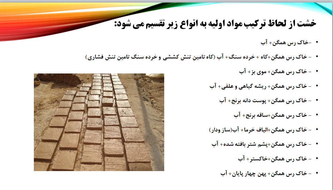 خشت از لحاظ ترکیب مواد اولیه به انواع زیر تقسیم می شود: