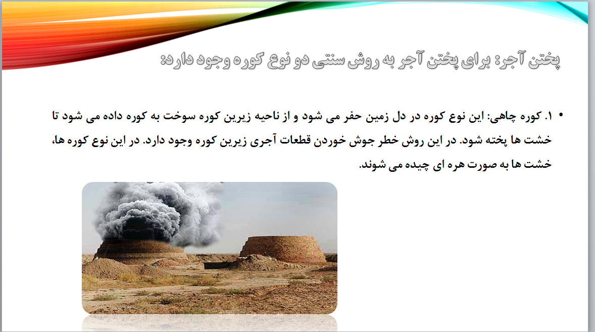 پختن آجر: برای پختن آجر به روش سنتی دو نوع كوره وجود دارد: