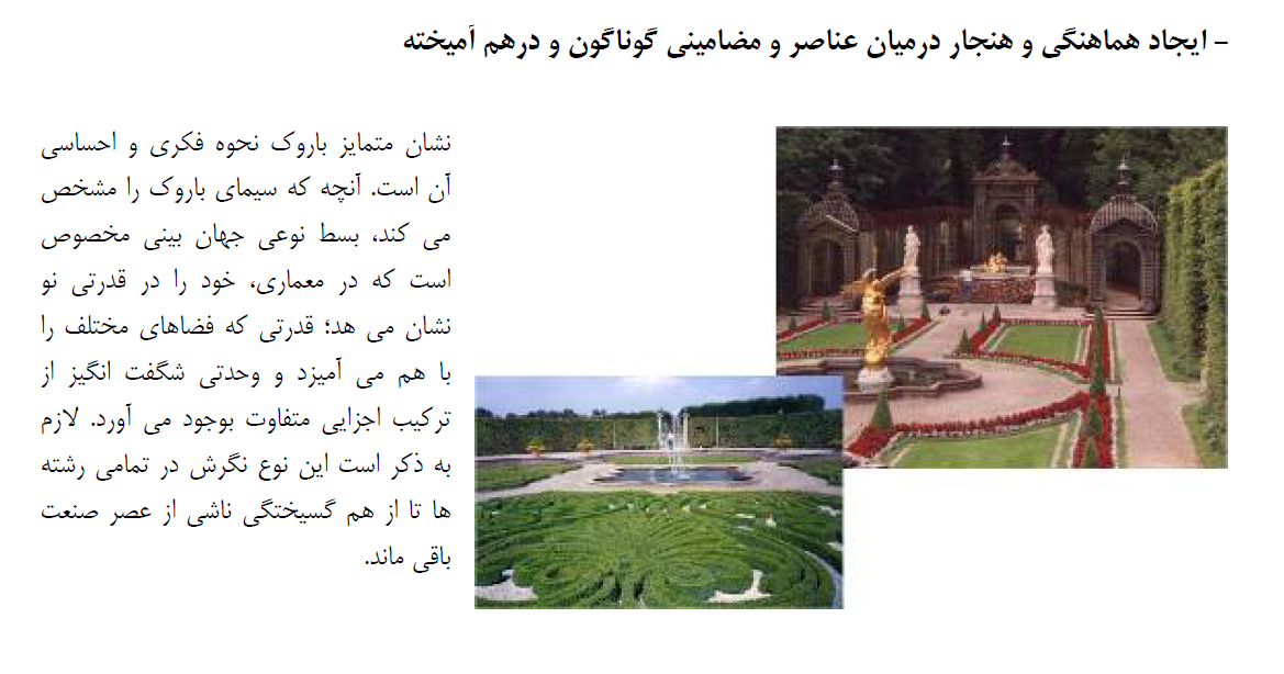- به خدمت گرفتن عناصر اصلی پیكرتراشی و نقاشی و سایر هنرهای تزئینی برای ایجاد اثری كامل