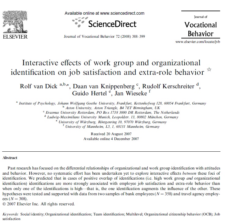 1- تحقیقات گذشته بر روابط افتراقی هویت کار گروهی و سازمانی با گرایش رفتار تمرکز داشتند اگر چه تلاش سیستماتیکی در مورد کشف اثر متقابل بین اینها هنوز تقبل نشده است. ما هم پوشی مثبتی به این نمونه ها پیش بینی می کنیم (کار گروهی و هویت سازمانی بالا) که این هویت با رضایت شغلی و نقش فوق العاده رفتار وابسته است تا هنگامی که فقط یکی از هویتها زیاد باشد و اثرات دیگر را تقویت کند این فرضیات و با داده هایی از 2 نمونه کارمندان بانک (358N=) و کارمندان آژانس مسافرتی (308N=) مورد حمایت و آزمون قرارگرفته اند.