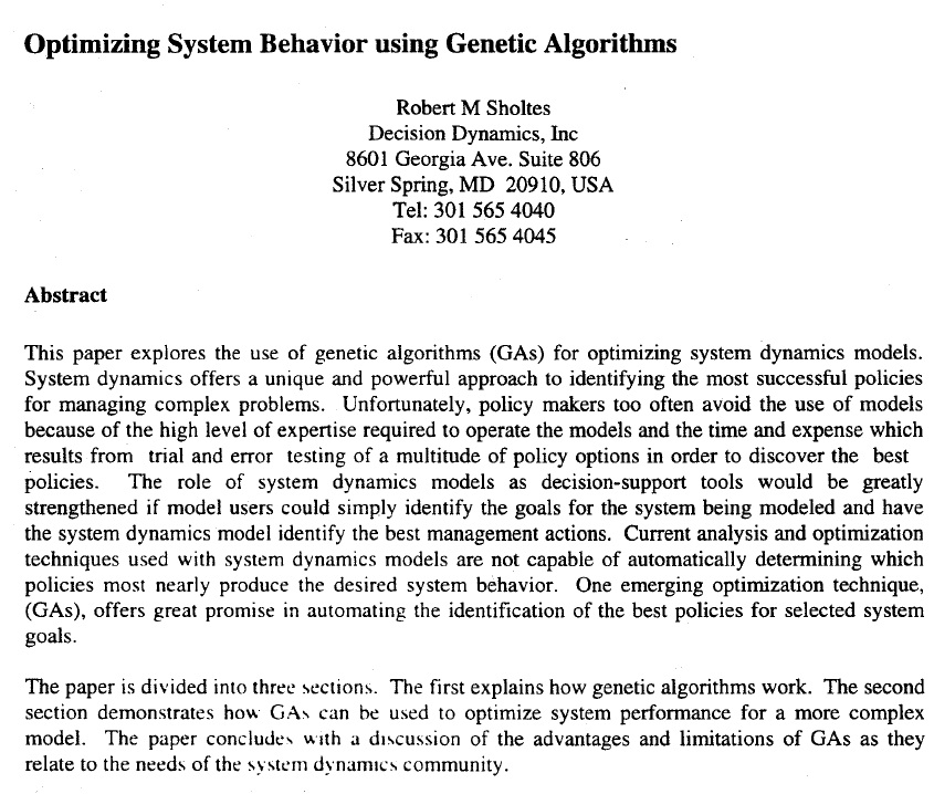در این مقاله به بررسی استفاده از الگوریتم سیستم ژنتیک (گاس) (Gas) Genetic Algorithms System برای بهینه سازیمدل های دینامیک سیستماست. سیستم های دینامیک یک روش منحصر به فرد و قدرتمند برای شناسایی موفق ترین سیاست برای مدیریت مشکلات پیچیده ارائه می دهد. متاسفانه، سیاستگذاران اغلب استفاده از این مدل ها به دلیل نیاز به سطح بالای تخصص مورد نیاز برای کاربا مدل ها و نیاز به زمان و هزینه در کسب نتایج از آزمایش و تست و خطای فراوانی که در این تست ها وجود دارد از این گزینه ها به منظور کشف بهترین سیاست در تصمیم گیری اجتناب می کنند .