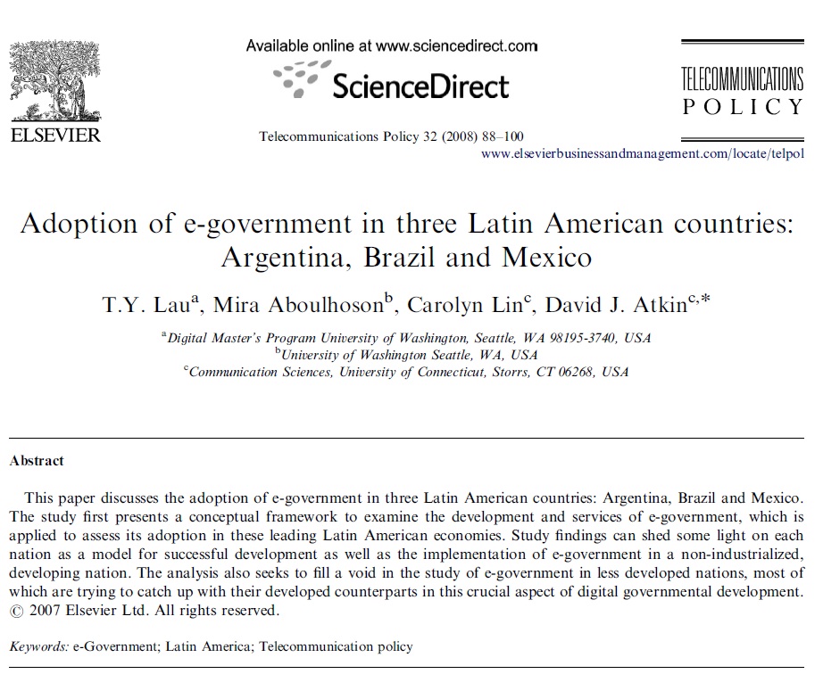 این مقاله اقتباس دولت الكترونیك در سه كشور آمریكای لاتین: آرژانتین، برزیل و مكزیك را مورد بحث قرار می دهد. تحقیق ابتدا یك چارچوب مفهومی برای بررسی ایجاد و خدمات دولت الكترونیك را ارایه میكند كه برای ارزیابی اقتباس آن در این سه اقتصاد مهم آمریكای لاتین اعمال شده است. یافته های تحقیق می تواند هر كشور به عنوان مدلی برای توسعه موفق و همچنین اجرای دولت الكترونیك در یك كشور در حال توسعه غیر صنعتی را معرفی كند. تجزیه و تحلیل هم چنین در جستجوی یافتن یك خلا در مطالعه دولت الكترونیك در كشورهای كمتر توسعه یافته می باشد كه بخش آن ها تلاش می كنند در این جنبه حیاتی از توسعه دولت دیجیتال به همتایان توسعه یافته خود برسند.