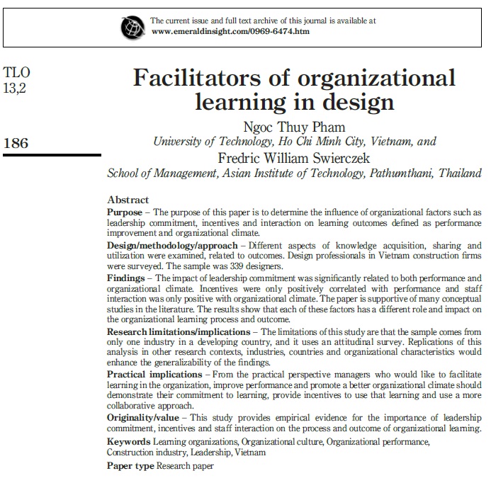 – Different aspects of knowledge acquisition, sharing and utilization were examined, related to outcomes. Design professionals in Vietnam construction firms were surveyed. The sample was 339 designers.