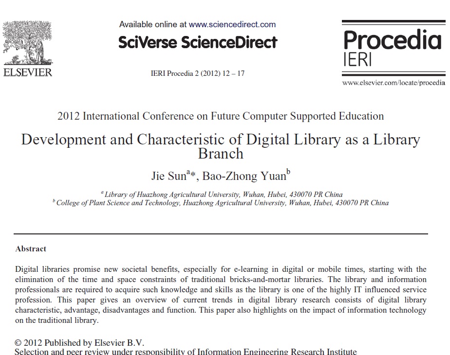این مقاله نگاهی می اندازد به روند جاری در تحقیقات کتابخانه دیجیتال که شامل مشخصات کتابخانه دیجیتال، مزایا و عملکرد آن می شود. این مقاله تاثیر فن آوری اطلاعات به روی کتابخانه سنتی را برجسته می نماید.
