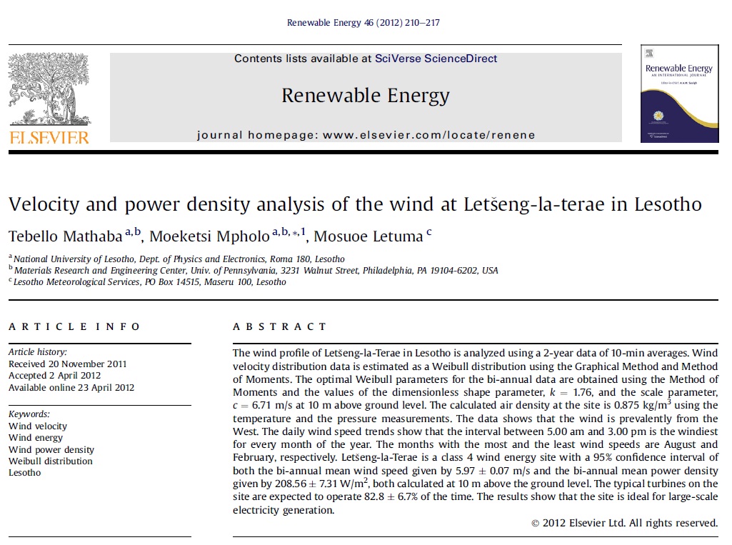 Wind velocity; Wind energy; Wind power density; Weibull distribution; Lesotho
