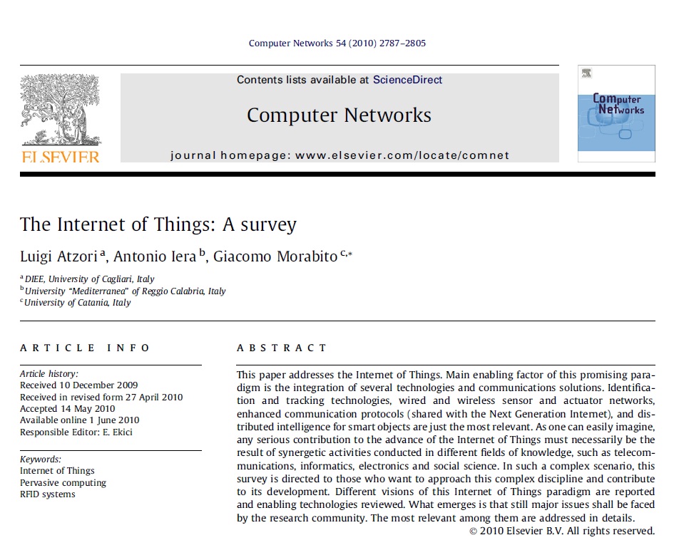این مقاله، اینترنت اشیا را نشان می دهد. مهم ترین عامل توانمند کننده این نظریه امیدبخش، ادغام چندین فرایند و چندین راه ارتباطی است. شناسایی و ردیابی فن آوری ها، شبکه های عامل و حسگر با سیم و بی سیم، طرح های ارتباطی ارتقا یافته (مشترک با اینترنت نسل بعدی) و هوش ابزارهای هوشمند، بیشترین ارتباط را دارند. همان طور که می توان به راحتی تصور کرد، هر تاثیر جدی در پیشرفت اینترنت اشیا، باید ضرورتا نتیجه فعالیت های همسو در حوزه های مختلف علمی باشد، از جمله ارتباطات رادیویی، علوم اطلاعات، الکترونیک و علوم اجتماعی. در چنین طرح پیچیده ای، این بررسی در جهت اهداف افرادی است که می خواهند به این رشته وارد شده و در پیشرفت آن نقش داشته باشند. دیدگاه های مختلف این نظریه اینترنت اشیا، گزارش شده و فن آوری های توانمند کننده آن، مورد ارزیابی قرار گرفته اند. چیزی که وجود دارد، همچنان مساله مهمی است که با در تحقیقات مورد بررسی قرار گیرد. مرتبط ترین در این میان، با جزئیات کامل تشریح شده اند.