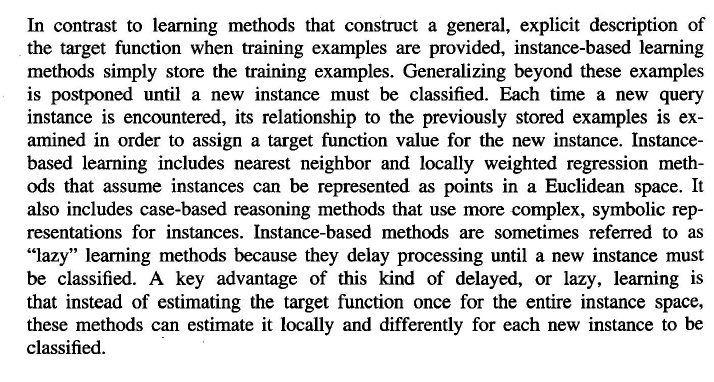 Examples of instance-based learning algorithm are the k-nearest neighbor algorithm, kernel machines and RBF networks.[3]:ch. 8 These store (a subset of) their training set; when predicting a value/class for a new instance, they compute distances or similarities between this instance and the training instances to make a decision.