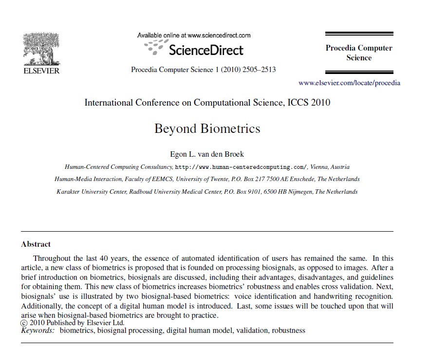 Throughout the last 40 years, the essence of automated identification of users has remained the same. In this article, a new class of biometrics is proposed that is founded on processing biosignals, as opposed to images. After a brief introduction on biometrics, biosignals are discussed, including their advantages, disadvantages, and guidelines for obtaining them. This new class of biometrics increases biometrics’ robustness and enables cross validation. Next, biosignals’ use is illustrated by two biosignal-based biometrics: voice identification and handwriting recognition. Additionally, the concept of a digital human model is introduced. Last, some issues will be touched upon that will arise when biosignal-based biometrics are brought to practice.