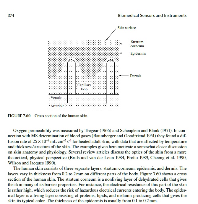 پوست انشان شامل سه لایه است: نسوج سلولی، روپوست و غشای میانی پوست. این لایه ها از نظر ضخامت از 0.2 تا 2 میلیمتر در بخش های مختلف بدن تفاوت دارند. تصویر 7.60 مقطع عرضی پوست انسان را نشان می دهد. لایه شاخی یک لایه غیرزنده از سلول های بی آب شده است که بسیاری از ویژگی های ممانعتی پوست را به آن می دهد. برای مثال، مقاومت الکتریکی این بخش پوشت نسبتا بالا است که ریسک جریان های الکتریکی خطرناک ورودی به بدن را کاهش می دهد. لایه روپوست یک لایه زنده متشکل از پروتئین ها، لیپیدها و سلول های تولیدکننده ملانین است که رنگ معمولی پوست را به آن می دهد. ضخامت روپوست معمولا از 0.1 تا 0.2 میلیمتر است.
