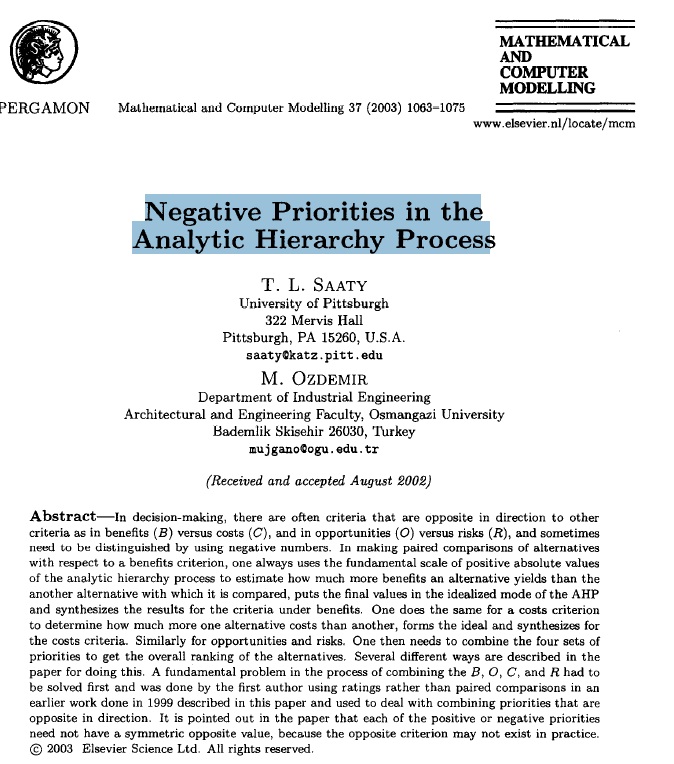 در تصمیم گیری اغلب معیارهایی وجود دارد که در تضاد با معیارهای دیگر می باشند، مثلا مزایا در برابر هزینه ها و فرصتها در برابر ریسکها قرار دارند، و گاهی اوقات لازم است که این معیارها را با استفاده از اعداد منفی (معکوس) تمیز داد. AHP در مقایسات زوجی گزینه ها، نسبت به معیار مزایا (benefits) برای برآورد اینکه یک گزینه نسبت به گزینه دیگر که با آن مقایسه میشود چه مقدار مزایای بیشتری دارد همواره از مقادیر مثبت استفاده می کند. AHP در روش ایده آل مقادیر نهایی را قرار داده و نتایج آن را برای معیارهای مزایا ترکیب میکند. همین شیوه را می توان برای معیار هزینه ها انجام داد. برای اینکه تعیین کنیم هزینه های یک گزینه چه مقدار بیشتر از گزینه دیگر است، حالت ایده آل آن را تشکیل داده و آن را برای معیارهای هزینه ترکیب کنید. این کار را بطور مشابه برای فرصتها و ریسکها نیز می توان انجام داد. بنابراین نیاز است تا چهار مجموعه اولویت بندی را برای رتبه بندی کلی گزینه ها ترکیب کنیم. در این مقاله چندین شیوه متفاوت برای انجام این کار ارائه گردیده است. ابتدا باید مشکل اصلی در فرآیندترکیبB, R, O. C (مزایا، هزینه ها، فرصتهاو ریسکها) حل شود، که این کار پیش از این در مقاله ای دیگر در سال 1999 بوسیله نویسنده اول با استفاده از رتبه بندی بجای مقایسات زوجی انجام شده است که در این مقاله توصیف شده و برای برخورد با ترکیب اولویتهایی که در جهت مخالف هستند استفاده شده است. در این مقاله اشاره شده است که هر اولویت بندی مثبت و منفی نیاز به مقدار متقابل متناسب ندارد، بخاطر اینکه مقدار متقابل ممکن است در عمل وجود نداشته باشد.