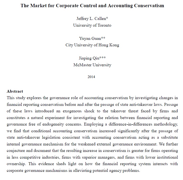 این مطالعه، با بررسی تغییراتِ در محافظه کاریهای گزارشات مالی قبل و بعد از وضعِ قوانین ضد مالکیتِ دولت، نقش حکومت محافظه کارانه درحسابداری را بررسی میکند. تصویب این قوانین، شوکّی خارجی به شرکتهای مواجه شده با این تهدید (تهدید مالکیت) وارد میکند و به منزله آزمایشی طبیعی برای بررسی رابطه بین گزارشگری مالی و حکومت عاری از نگرانی درون زادی(داخلی) می باشد. با استفاده از این روش غیر تجربی در می یابیم که ، پس از تصویب قوانین ضد مالکیتِ دولتِ دارایِ محافظه کاری حسابداری ای که به عنوان مکانیزم جایگزینی حاکمیت داخلی برای تضعیف محیط حکومت خارجی عمل می کند، محافظه کاریِ حسابداریِ مشروط به میزان قابل توجهی افزایش یافته است. ما با استناد به حدس و گمان و اسناد متعدد دریافتیم که افزایش محافظه کاری بیشتر در شرکت های فعال در صنایع کم رقابت است، شرکت های با عملکرد بهتر، و شرکت های با مالکیت نهادیِ کمتر. این شواهد اطلاعاتی را در زمینه نحوۀ تعامل سیستمِ گزارشگرِ مالی با مکانیزم های حاکمیت شرکتی در کاهش مشکلات بالقوه نمایندگی به ما می دهد.