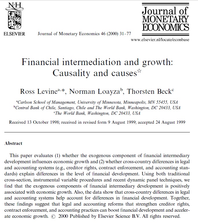این مقاله این موارد را ازیابی می کند: (1) آیا جزء بیرونی شد و توسعه ی واسطه گری مالی در واقع رشد اقتصادی را تحت تأثیر قرار می دهد و (2) آیا اختلافات و تفاوت ها در سیستم های حسابداری و حقوقی کشورها (مثلا: حقوق بستانکار، اجرای قرارداد و استانداردهای حسابداری) تفاوت ها در سطح توسعه و رشد مالی را توضیح می دهند. با استفاده از فرآیندهای متغیر ابزاری میان- بخشی/عرضی (Cross-section) قدیمی و تکنیک های گروهی پویا/ دینامیکی اخیر، ما درمی یابیم که اجزاء بیرونی رشد و توسعه ی واسطه گری مالی با رشد اقتصادی ارتباط مثبت دارند. علاوه بر این، داده ها نشان می دهند که تفاوت های میان کشوری از لحاظ سیستم های حسابداری و حقوقی به در نظر گرفتن تفاوت ها در رشد و توسعه ی مالی کمک می کنند. علاوه بر اینها، این یافته ها نشان می دهند که اصلاحات حقوقی و حسابداری که حقوق بستانکار (یا وام دهنده)، اجرای قرارداد و عملیات حسابداری را تقویت می کنند می توانند رشد و توسعه ی مالی را افزایش دهند و به رشد اقتصادی سرعت بخشند.