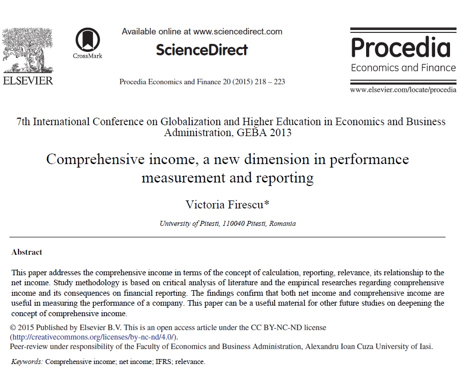 This paper addresses the comprehensive income in terms of the concept of calculation, reporting, relevance, its relationship to the net income. Study methodology is based on critical analysis of literature and the empirical researches regarding comprehensive income and its consequences on financial reporting. The findings confirm that both net income and comprehensive income are useful in measuring the performance of a company. This paper can be a useful material for other future studies on deepening the concept of comprehensive income.