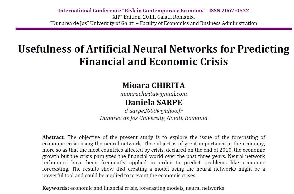 هدف این مقاله کشف مساله پیشگویی بحران اقتصادی با استفاده از شبکه ی عصبی است. این موضوع در اقتصاد بسیار با اهمیت است. بیشتر کشورهایی که تحت تاثیر این بحران قرار گرفته اند. در اواخر سال 2010 اعلام کردند که بحران اقتصادی طی سه سال گذشته، جهان مالی را فلج کرده است.