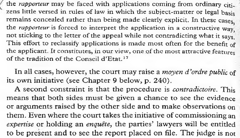 ممکن است مخبر کمیسیون با درخواست هایی مواجه شود که از سوی شهروندانِ عادی مطرح شده که در مورد اصل حاکمیت قانون اطلاعات اندکی دارند ، در این صورت موضوع یا مبنای حقوقی آن بیشتر پنهان باقی می ماند تا اینکه به صراحت عنوان شود. در این گونه پرونده ها ، مخبر کمیسیون مجبور است درخواست را بصورت قانونی مطرح کرده و مادامی که با محتوای درخواست تناقضی ندارد آن را به نامه تقاضای تجدید نظر الصاق نمی کند. تلاش برای طبقه بندی مجدد درخواست ها به این دلیل انجام می شود که به نفع متقاضی است. به اعتقاد ما این یکی از بهترین ویژگی های رسوم شورای دولتی است. در تمام پرونده ها ، دادگاه برای در دست داشتن ابتکار عمل یکی از سیاست های عمومی خود را اجرا می کند. دومین محدودیت آیین دادرسی ، ضد و نقیض بودن است. این به دان معنا است که طرفین دعوا این شانس را به دست می آورند که درجریان شواهد یا دلایل مطرح شده توسط طرف مقابل قرار گرفته و بر آن ها نظارت داشته باشند. حتی در جایی که دادگاه پیشنهاد ماموریت دادن به یک کارشناس یا پیشنهاد تفحص بیشتر را مطرح کند، وکلای دو طرف مجاز هستند که حضور پیدا کرده و از محتوای گزارشاتی که در پرونده قرار داده می شود آگاه شوند. قاضی دادگاه مجاز نیست براساس اسنادی که طرفین دعوا آن ها را مشاهده نکرده اند تصمیم گیری کند. البته براساس مضمون اقامه دعوا دادگاه می تواند به متقاضی نیز اجازه دهد به برخی اسنادی که دادگاه براساس بررسی آن ها حکم صادر می کند