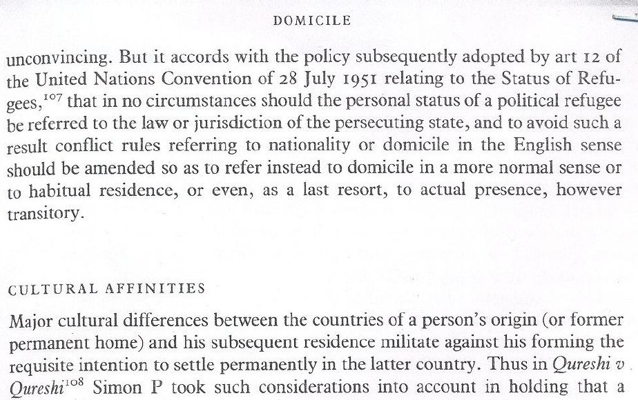 اما این مورد براساس سیاست متعاقبا اتخاذ شده توسط بند 12 توافق ملل متحد در 28 جولای 1951 است که با وضعیت پناهجویان مرتبط است و در آن تحت هیچ شرایطی نباید وضعیت شخصی پناهنده سیاسی به قانون یا حوزه قضای کشور تعقیب کننده وی فرستاده شود و برای پرهیز از این چنین تناقضی، باید قوانین ارجاع شونده به ملیت یا اقامت در تعریف انگلیسی به صورتی اصلاح شود تا در عوض به اقامت در معنای نرمال تر آن یا سکونت دائمی یا حتی، به عنوان اخرین دست آویز، به حضور واقعی، هرچند گذرا، اشاره کند.