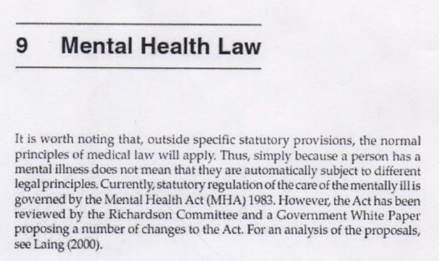 شایان ذکر است که، در خارج از محدوده مقررات قانونی خاص، اصول حقوق پزشکی اعمال میشود، بنابراین تنها به این دلیل که یک فرد دارای بیماری روانی است این معنا را نمیرساند که این فرد به طور خودکار با اصول حقوقی مختلفی در ارتباط است. در حال حاضر، مقررات قانونی مربوط به مراقبت از بیمار روانی توسط قانون سلامت روانیMHA) 1)83) کنترل و مدیریت می شود. با این حال، این قانون با پیشنهاد ایجاد برخی تغییرات در این قانون از سوی کمیته ریچاردسون و گزارش هیئت دولت مجددا بازبینی و بررسی شد. برای تجزیه و تحلیل طرح های پیشنهادی، قسمت لینگ (2000) را ببینید.
