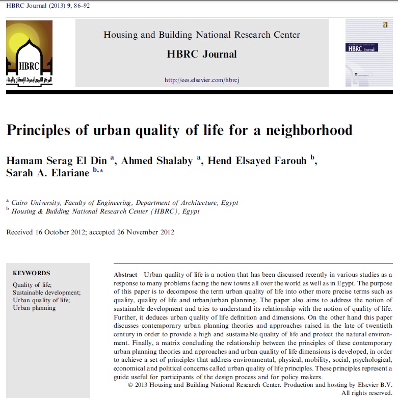 کیفیت زندگی شهری ایده ای است که اخیرا در مطالعات مختلف بعنوان پاسخ به چندین مسئله که شهرهای جدید در سراسر جهان بعلاوه در مصر با آن مواجه هستند مورد بررسی قرار گرفته است. هدف این مقاله تجزیه اصطلاح کیفیت زندگی شهری به اصطلاحات دقیقتر مانند کیفیت، کیفیت زندگی و برنامهریزی شهری/شهری میباشد. این مقاله همچنین قصد دارد تا ایده رشد پایداری را بررسی کند و سعی دارد تا رابطه آن را با ایده کیفیت زندگی بفهمد. از طرف دیگر این مقاله نظریهها و روشهای برنامه ریزی شهری معاصر که در اواخر قرن 20ام برای ارائه کیفیت بالا و پایدار برای زندگی و حفظ محیط طبیعی ارائه شدند را بررسی میکند. نهایتا، یک ماتریس شامل رابطه بین اصول این نظریه ها و روشهای برنامه ریزی شهری معاصر و ابعاد کیفیت زندگی شهری ایجاد میشود برای بدست آوردن یک مجموعه از اصول که مسائل محیطی، فیزیکی، حرکتی، اجتماعی، روانی، اقتصادی و سیاسی که به نام اصول کیفیت زندگی شهری نامیده میشود را بررسی میکند. این اصول راهنمای مفیدی را برای شرکتکنندگان در فرایند طراحی و برای سیاستگذاران ارائه میکند.