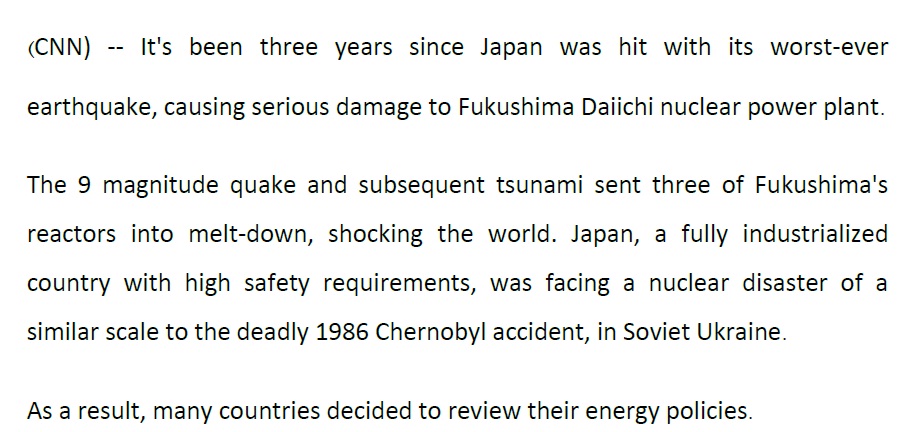 زلزله ی 9 ریشتری و پیامدهای سونامی که باعث نابودی کامل سه راکتور در فوکوشیما شده بود جهان را غافگیر کرد. ژاپن که یک کشور کاملا صنعتی ودارای تجهیزات امنیتی بالا است با فاجعه ای اتمی مواجه شدکه کاملا مشابه فاجعه ی اتمی سال 1986 چرنوبیل در اوکراین بود.