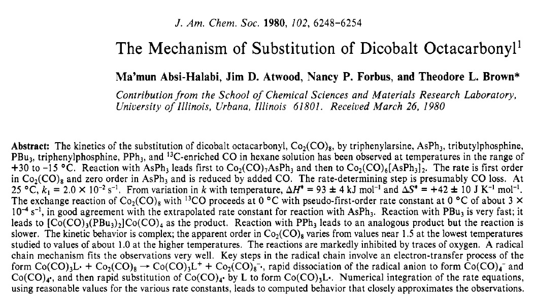 سینتیک جانشینی دی کبالت اکتاکربونیل، Co2(CO)8 توسط تری فنیل آرسین، AsPh3، تری بوتیل فسفین، PBu3، تری فنیل فسفین، PPh3 و CO غنی شده از 13C در محلول هگزان در دماهایی در گستره 30+ تا 15- درجه سانتیگراد مشاهده شده است. واکنش با AsPh3 ابتدا منجر به Co2(CO)7 و سپس به Co2(CO)6[AsPh3]2 می شود. سرعت در Co2(CO)8 مرتبه اول و در AsPh3 از مرتبه صفر است و با CP اضافه شده کاهش می یابد. مرحله تعیین کننده سرعت احتمالا از دست رفتن CO است. در 25 درجه سانتیگراد، k1 = 2.0 × 10-2ثانیه-1 است. با توجه به تغییر در k با دما، = 93±4 کیلوژول مول-1 و = 42+ ± 10 ژول کلوین-1 مول-1 است. واکنش مبادله Co2(CO)8 با 13CO در 2 درجه سانتیگارد با ثابت سرعت شبه درجه اول در 0 درجه سانتیگراد حدود 3 × 10-4 ثانیه-1 پیشروی می کند که مطابقت خوبی با ثابت سرعت برون یابی شده برای واکنش با AsPh3 دارد. واکنش با PBu3 بسیار سریع است؛ این منجر به تولید [Co(CO)3(PBu)2]Co(CO)4 به عنوان محصول می شود. واکنش با PPh3 منجر به تولید محصول مشابه می شود اما واکنش آهسته تر است. رفتار سینتیک پیچیده است؛ مرتبه ظاهری در Co2(CO)8 از مقادیر نزدیک به 1.5 در پایین ترین دماهای مطالعه شده تا مقادیر حدود 1.0 در دماهای بالاتر تغییر می کند. واکنش ها تا حد زیادی با مقادیر ناچیز اکسیژن کُند می شوند. مکانیسم رادیکالی به خوبی با این مشاهدات مطابقت دارد. مراحل کلیدی در زنجیر رادیکالی شامل فرآیند انتقال الکترون از Co (CO)3L. + Co2(CO)8 à Co(CO)3L+ + Co2(CO)8-، تجزیه سریع آنیون رادیکالی برای ایجاد Co(CO)4- و Co(CO)4. و سپس جانشینی سریع Co(CO)4. با L به منظور ایجاد Co(CO)3L. است. انتگرال گیری عددی معادلات سرعت، با استفاده از مقادیر مناسب برای ثابت های سرعت متنوع، منجر به ایجاد رفتار محاسبه شده ای گردیده است که تا حد زیادی به مشاهدات نزدیک است.