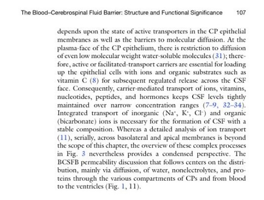 در ظاهر پلاسمای اپیتلیوم CP، محدودیتی برای انتشار وزن پایین مولکولی مولکول های قابل حل در آب وجود دارد ؛ بنابراین ، انتقال فعال یا تسهیل شده ی ناقلان برای بارگیری سلول های اپیتلوم با یون ها و مواد ارگانیک مانند ویتامین c جهت آزاد سازی تحت کنترل در مقابل CSF ضروری است. در نتیجه ، ناقلان انتقال یون ها ، ویتامین ها، نوکلئوتیدها ، پپتیدها و هورمون هایی را متعادل می سازند که سطوح CSF حفظ شده تحت دامنه های محدود تجمع ، نگه داشته می شوند(9-7، 34-32). انتقال یکپارچه ی یون های ارگانیک و غیرارگانیک برای شکل گیری CSF با یک ترکیب ثابت و پایدار ضروری است. در حالیکه تحلیل جزء به جزء انتقال یون حوزه و نمایی از این فصل است ، مرور اجمالی این فرایندهای پیچیده در شکل 3 نشان داده شده است ، ازاین رو یک نمود و چشم انداز متراکم را ایجاد می کند. نفوذ پذیری BCSFB تشریح می کند که با متمرکز شدن پراکندگی ، از طریق انتشار و پخش ، آب ، غیرالکترولیت ها و پروتئین ها در بخش های مختلف CPs و از خون به بطن ها دنبال می شود.