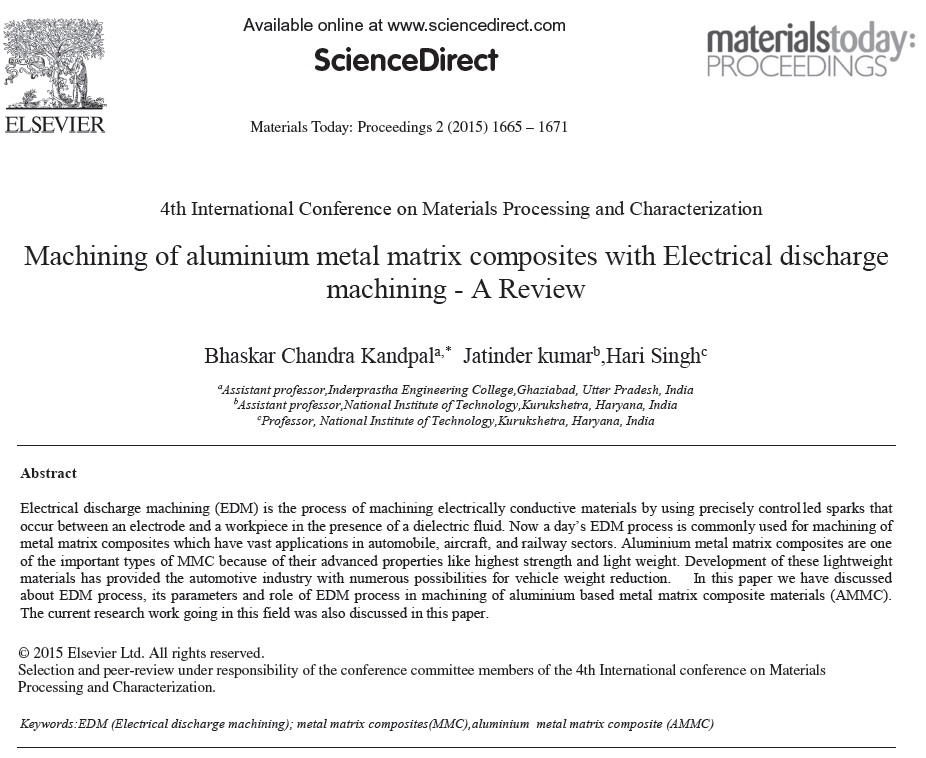 تراشکاری تخلیه الکتریکی (EMD) فرایند تراشکاری الکتریکی مواد رسانا با استفاده از جرقه های کنترل شده به طور دقیق است که بین یک الکترود و قطعه کار با وجود یک سیال دی الکتریک روی میدهد.اکنون فرایند EDM روز معمولا برای تراشکاری کامپوزیتهای ماتریس فلزی بکار میرود که دارای کاربردهای وسیعی در اتومبیل،هواپیما و بخشهای راه آهن است.کامپوزیتهای ماتریس فلزی آلومینیومی ،کامپوزیتهایی از انواع مهم MMC هستند که به خاطر ویژگی های پیشرفته شان میباشد مانند بالاترین استحکام و وزن کم.گسترش این مواد سبک وزن، امکانات زیادی را به صنعت اتومبیل برای کاهش وزن وسیله ی نقلیه بخشیده است.در این مقاله، ما در مورد فرایند EDM، پارامترها و نقش فرایند EDM در تراشکاری آلومینیوم مبتنی بر مواد کامپوزیت ماتریس فلزی بحث کرده ایم (AMMC).