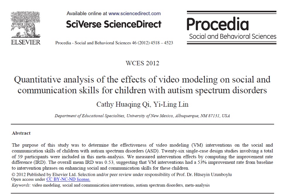 هدف از ارائه این مطالعه تحقیقی آن است که تاثیر مداخلات درمانی الگوبرداری ویدئو (vm) بر روی مهارتهای اجتماعی ومهارتهای ارتباطی کودکانی که از اختلالات گستره (طیف) اوتیسم (ASD) رنج می برند مشخص شود تحقیقات مبتنی بر 26 مورد طرح واحد26 نفر از شرکت کننده تان در ین نوع آنالیز متا درگیر ساخت. ما تاثیرات درمان مداخله جویانه بامحاسبه نسبت تفاوت سرعت بهبود مورد سنجش قرار دادیم (IRD) میانگین کلی نتایج IRD که در حدود 53% بود پیشنهاد می کرد که مداخلات درمانی vm (الگوبرداری ویدئویی) داری یک نسبت سرعت پیشرفت 53 درصدی از خط مبدا تا مراحل درمانی برای مهارتهای اجتماعی و مهارتهای ارتباطی این نوع کودکان بود. این مقاله در سال 2012 توسط انتشارات السویر به چاپ رسیده است و یا بررسی و انتخاب دقیق این مقاله تحت سرپرستی دکتر حسین اوزوبوبلو انجام شده است.