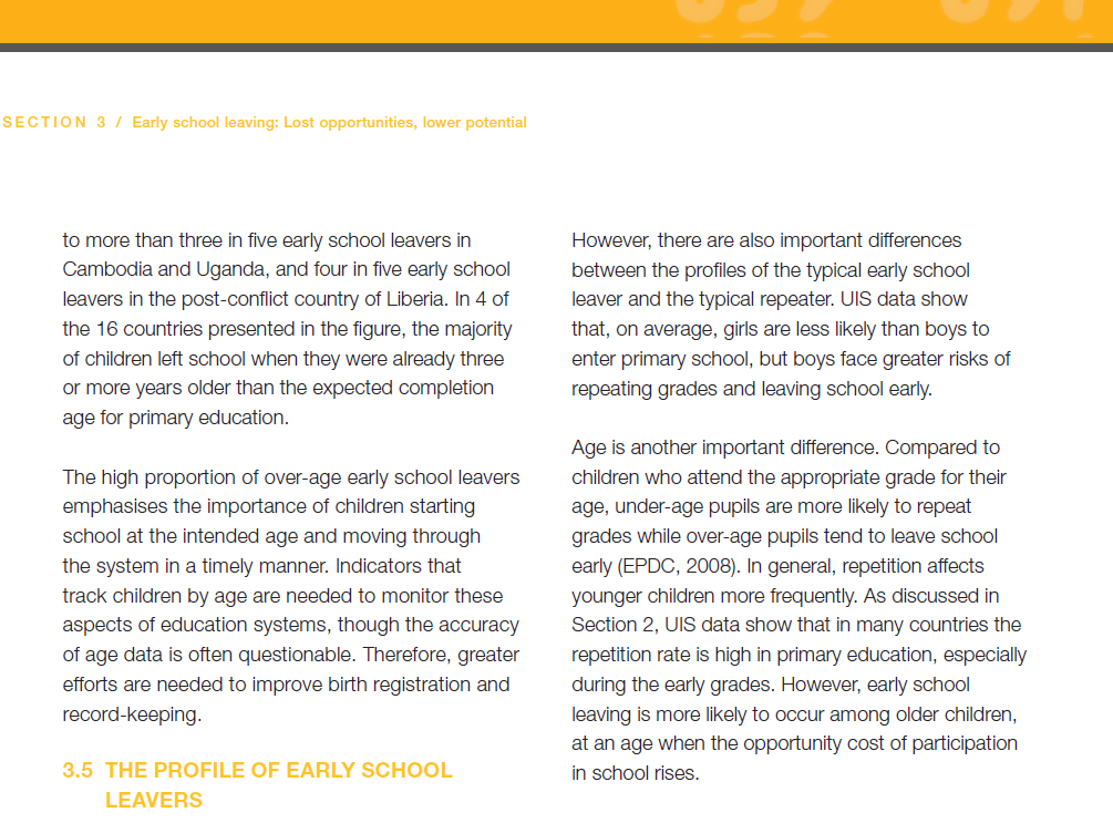 در 4 کشور از 16 کشوری که در شکل دیدید اکثر کودکان زمانی مدرسه را ترک میکنند که سه سال یا بیشتر از سایر کودکانی که دوره ابتدایی را به پایان میرسانند بزرگتر هستند . نسبت بالای ترک کنندگان مدرسه در سنین بالا بر اهمیت این مسئله تاکید میکند که کودکان باید مدرسه را در سن در نظر گرفته شده آغاز کنند و در این سیستم همگام با زمان حرکت کنند. شاخصهایی که کودکان را بواسطه سن پیگیری میکنند لازم است تا این وجوه سیستمهای آموزشی را تحت نظارت قرار دهند اگرچه دقت صحت داده ها اغلب مورد پرسش است. بنابراین باید تلاشهای بیشتری صورت بگیرد تا ثبت تولید و نگهداری سوابق بهتر انجام شود.