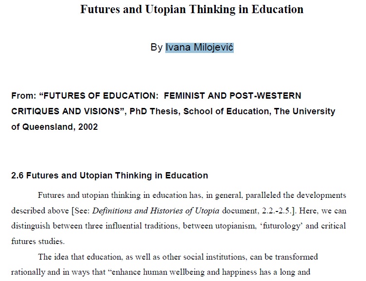 Futures and utopian thinking in education has, in general, paralleled the developments described above [See: Definitions and Histories of Utopia document, 2.2.-2.5.]. Here, we can distinguish between three influential traditions, between utopianism, ‗futurology‘ and critical futures studies.