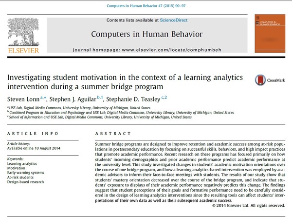 تحقیق اخیر بر روی این برنامه هایی تمرکز دارد که ابتدا به چگونگی جمعیت شناسی درحال حاضر دانشجویان می پردازد و عملکرد سابق آکادمیکی (تحصیلی) که پیشرفت عملکرد آکادمیک را در سطح دانشگاه پیش بینی می کند نظر دارد. این تحقیق تغییرات مرتبط با تشخیص موقعیت های انگیزش آکادمیک دانشجویان در دوره اجرای برنامه بریج را مورد بررسی قرار دهد و به چگونگی یکی از تحلیل های یادگیری که مبتنی بر نوعی مداخله درمانی است توجه دارد که این شیوه توسط مشاوران تحصیلی ـ آموزشی اعمال می شود که از ملاقاتهای رو در روی با دانشجویان اطلاع و آگاهی لازم را دارا می باشند. نتایج مطالعات ما نشان می دهد که تشخیص کنترلی دانشجویان در طول دوره اجرای برنام بریج کاهش یافته است و همچنین نشان داده شده است که دانشجویان درمعرض نشانه هایی از نمایش عملکرد آکادمیک خود قرار گرفته اند که به طور منفی این نوع تغییر را پیش بینی می کنند. یافته های حاصل از این طرح تحقیقی پیشنهاد می کنند که تصورات دانشجویان از اهدافشان و عملکردهای سازنده شان لازم است تا به دقت در طرح مداخلات درمانی حاصل از تحلیل های یادگیری لحاظ شود و این بدان علت می باشد که ابزارهای نتیجه ای می توانند تفاسیر و مفاهیم دانشجویان از داده های کسب شده خودشان تاثیر بگذارند که این تاثیر همچنین موفقیت تحصیلی (آکادمیک) بعدی را برای آنها به دنبال خواهد آورد.