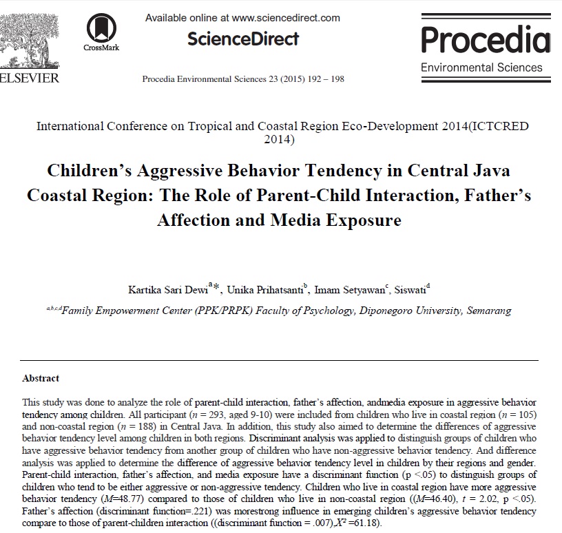 این مطالعه با هدف آنالیز نقش متقابل والدین – فرزند ، توجه و عاطفه پدر وتاثیر رسانه در گرایش رفتار کودکان به سمت وسوی پرخاشگری صورت گرفته است. همه کودکان مورد مطالعه ( تعداد 293 کودک 9، 10 ساله ) که 105 نفر آنها در منطقه ساحلی و 188 نفر آنها در مناطق غیر ساحلی جاوا مرکزی زندگی می کند.علاوه بر این هدف دیگر این مطالعه تعیین تفاوت سطح گرایش رفتاری کودکان به سوی پرخاش در دومنطقه نیز می باشد.از انالیز تفکیک کننده به منظور تفکیک گروههایی از کودکان که گرایش به پرخاش دارند از گروه هایی که چنین گرایشی ندارند استفاده شد. همچنین آنالیز تفاوت جهت تعیین تفاوت سطح نامبرده با توجه به منطقه زندگی وجنسیت آنها به کار گرفته شد.طبق تابع تفکیک کودکانی که در منطقه ساحلی زندگی می کنند در مقایسه با کودکانی که در منطقه غیر ساحلی هستند گرایش بیشتری به پرخاشگری دارند. در مقایسه با تاثیر تعامل والدین – فرزند، عاطفه وتوجه پدر بیشترین تاثیر را در پدید امدن گرایش پرخاشگرایانه کودکان داشت.