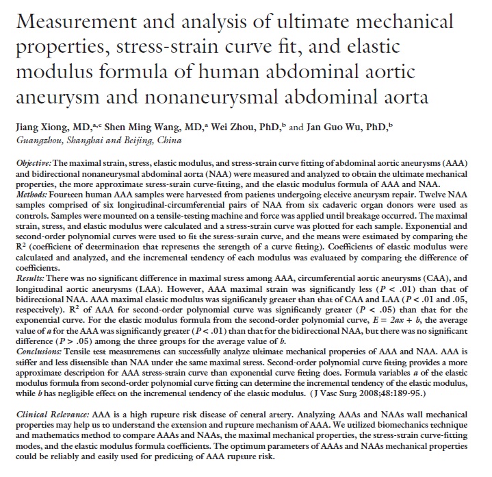 The maximal strain, stress, elastic modulus, and stress-strain curve fitting of abdominal aortic aneurysms (AAA) and bidirectional nonaneurysmal abdominal aorta (NAA) were measured and analyzed to obtain the ultimate mechanical properties, the more approximate stress-strain curve-fitting, and the elastic modulus formula of AAA and NAA.