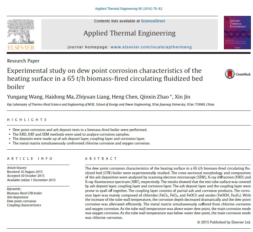 مشخصات خوردگی نقطه شبنم سطح گرمایش در یک دیگ بخار با کف باد افشانی شده ی دوار با سوخت توده زنده 65t/h (CFB) به طور آزمایشی مورد مطالعه قرار گرفت. متدولوژی سطح مقطعی و ترکیب رسوب خاکستر با میکروسکوپ الکترونی پویش گر(SEM) ،پراش پرتوی ایکس (XRD) و طیف فلوئورسانس پرتوی ایکس (XRF) به ترتیب مورد تحلیل قرار گرفتند. نتایج نشان داد سطح لوله آزمایش با لایه رسوب خاکستر ،لایه اتصال و لایه خوردگی، پوشش داده شد. لایه رسوب خاکستر و لایه اتصال ،تمایل داشتند با هم ورقه ورقه شوند. لایه اتصال متشکل از خاکستر ناتمام و محصولات خوردگی است. لایه خوردگی ،در اصل متشکل از کلرایدها (FeCU, FeCk, و FeOCl) و اکسیدها (FeOOH, Fe2O3) است.با افزایش دمای جداره ی لوله، عمق خوردگی به شدت کاهش یافت و خوردگی نقطه شبنم به طور کارامدی پایین آمد. ماتریس فلزی به طور همزمان دچار خوردگی کلرین و خوردگی اکسیژن میشود. همانطور که دمای جداره ی لوله،بالای نقطه شبنم آب بود، حالت خوردگی اصلی، خوردگی اکسیژن بود. همانطور که دمای جداره ی لوله زیر نقطه شبنم آب بود، حالت خوردگی اصلی، خوردگی کلرین بود.