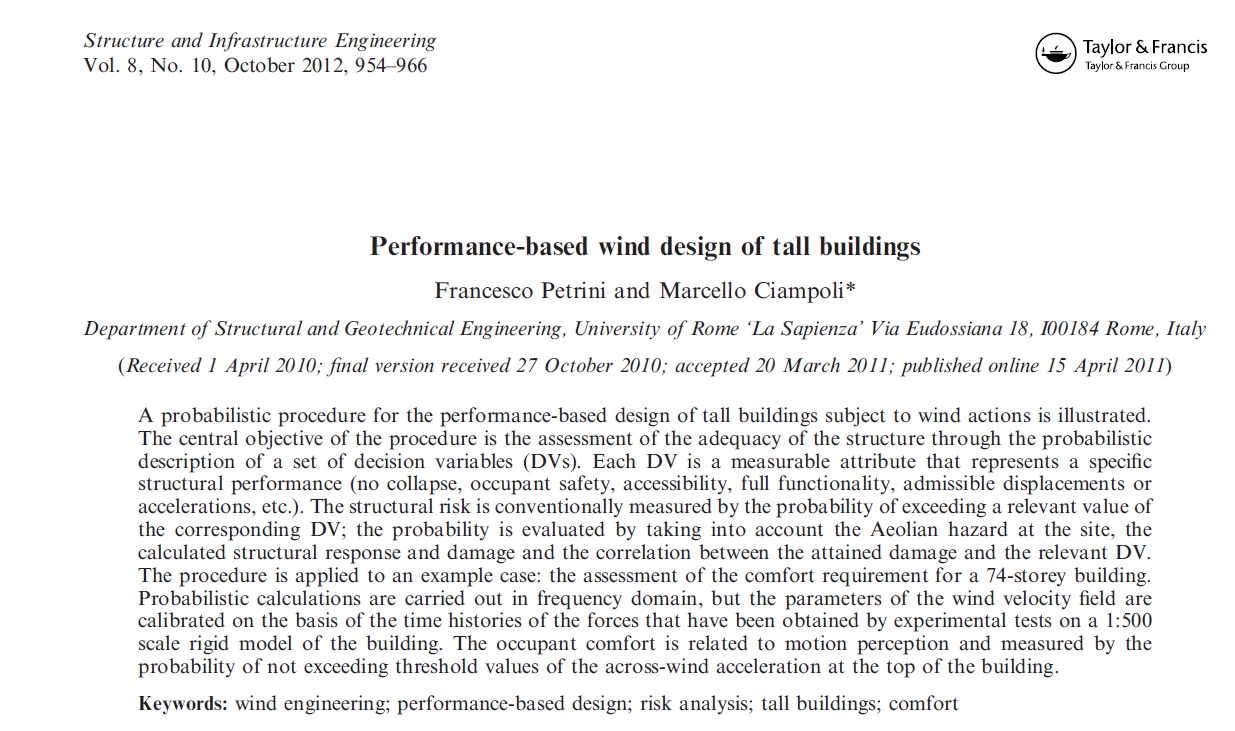 یک روند احتمالی برای طراحی مبتنی بر عملکرد ساختمان های بلند تحت تاثیر عملکردهای باد نشان داده شده است.هدف اصلی این روند ارزیابی کفایت و قابلیت سازه از طریق توصیف احتمالی مجموعه ای از متغیرهای تعیین شده می باشد(DVs). هر dv یک نسبت قابل اندازه گیری است که عملکرد یک سازه ی خاص را نشان می دهد(بدون فروریختن، امنیت ساکنین، قابلیت پذیرش عملکرد پذیری کامل ، جابجایی های قابل قبول یا شتاب و غیره).ریسک و خطر سازه توسط ارزش احتمالی مربوط به dv اندازه گیری می شود؛ این احتمال با توجه به مخاطره و خطرات باد در یک مکان ،پاسخ سازه ی محاسبه شده و آسیب و رابطه بین آسیب مشاهده شده و dv مربوطه ارزیابی می شود. این روش در یک مورد نمونه اعمال می شود: ارزیابی شرایط و الزامات راحتی در یک ساختمان 74طبقه آزمایش شد. محاسبات احتمالی در یک دامنه و حوزه فرکانس انجام شدند، اما پارامترهای میدان سرعت باد بر اساس پیشینه و تاریخچه زمانی نیروهایی ارزیابی و مدرج می شوند که از طریق آزمایشات تجربی در یک مدل سخت با مقیاس 1:500 در این ساختمان بدست می آیند.راحتی و آسایش ساکنین به درک حرکت مربوط می گردد و از طریق ارزش ها و مقادیر آستانه ی متجاوز احتمالی از شتاب باد مقابل در بالای ساختمان اندازه گیری می شود.